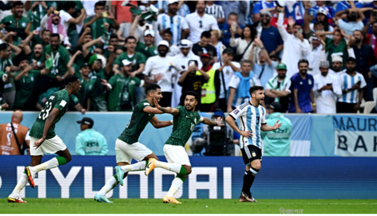 কাতার বিশ্বকাপে বড় অঘটনের জন্ম দিলো সৌদি আরব। র্যাঙ্কিংয়ের ৫১ নম্বরে থাকা গ্রিন ফ্যালকনরা ২-১ ব্যবধানে হারিয়ে দিয়েছে আর্জেন্টিনাকে। বিশ্বকাপের আগে টানা ৩৬ ম্যাচ অপরাজিত থাকা আলবিসেলেস্তেদের অপরাজেয় যাত্রার শেষটা হলো বিশ্বকাপের প্রথম ম্যাচেই। মূলত সৌদি আরবের ফরাসি কোচ হার্ভে রেনার্ডের কৌশলের কাছেই হেরে গেছে আকাশী-সাদারা।