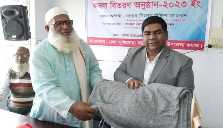 নোয়াখালীর সদর উপজেলার ৩২০ জন বীর মুক্তিযোদ্ধা ও তাদের পরিবারের মাঝে প্রধানমন্ত্রীর উপহার হিসেবে কম্বল বিতরণ করা হয়েছে। বৃহস্পতিবার (১৯ জানুয়ারি) দুপুরে জেলা মুক্তিযোদ্ধা কমপ্লেক্সে এসব কম্বল বিতরণ করেন সদর উপজেলার নির্বাহী কর্মকর্তা (ইউএনও) নিজাম উদ্দিন আহমেদ।